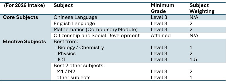 - Admission is based on the Best 5 HKDSE subject results with subject weighting. For details of subject weighting, please refer to the table below.